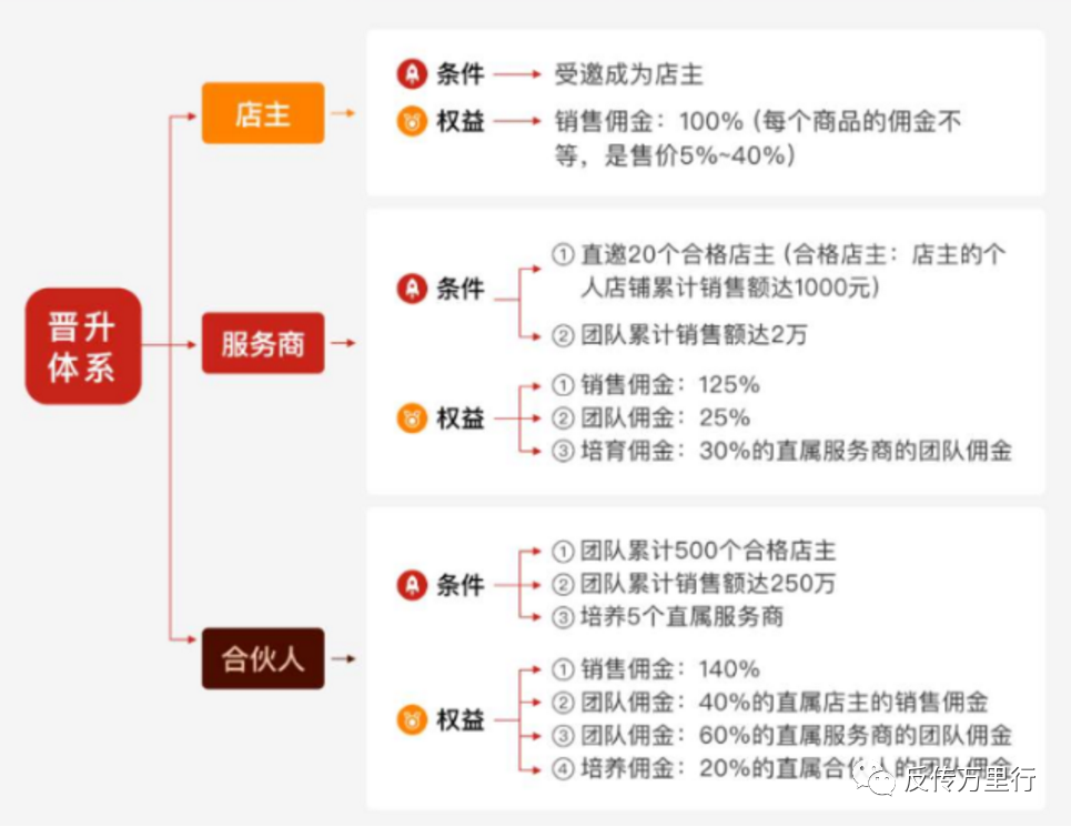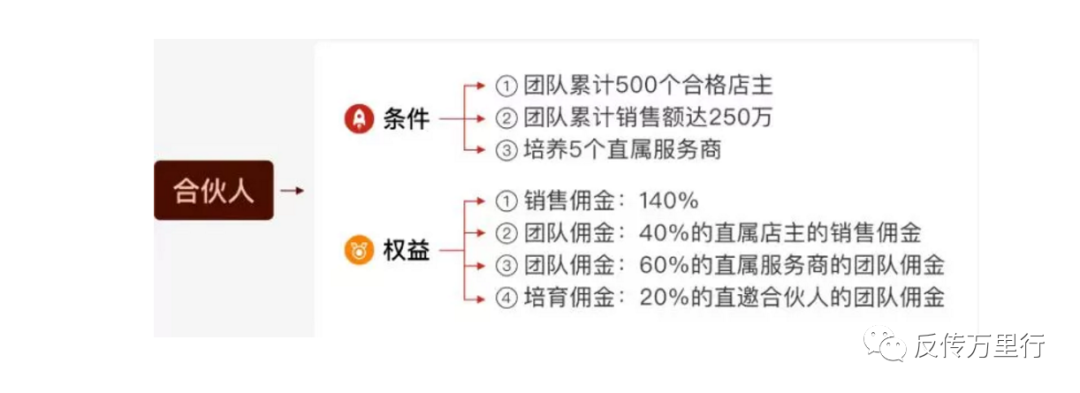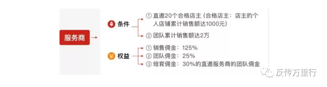 服务商:直邀20个合格店主(合格店主:个人店铺累计销售额达到1000元);团队累积销售额达2万。比如:A邀请了B,B再邀请了C,C再邀请了DEF,B是A的直邀,CDEF都是A的间邀。