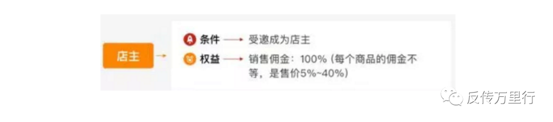 店主:受邀才能成为店主。换言之,只有平台的店主、服务商、合伙人发链接或者海报邀请你成为店主,注册后才能是店主,如果你自己进入小程序就是顾客,看不到佣金与店主们才能看到的页面。此外,销售佣金100%,指的是你成为店主后,登录小程序看到的佣金,就是你卖货赚的佣金或者自购可以省下来的钱。每个商品都有具体的佣金显示,比如:卖100元的商品你可以看到佣金是20元。