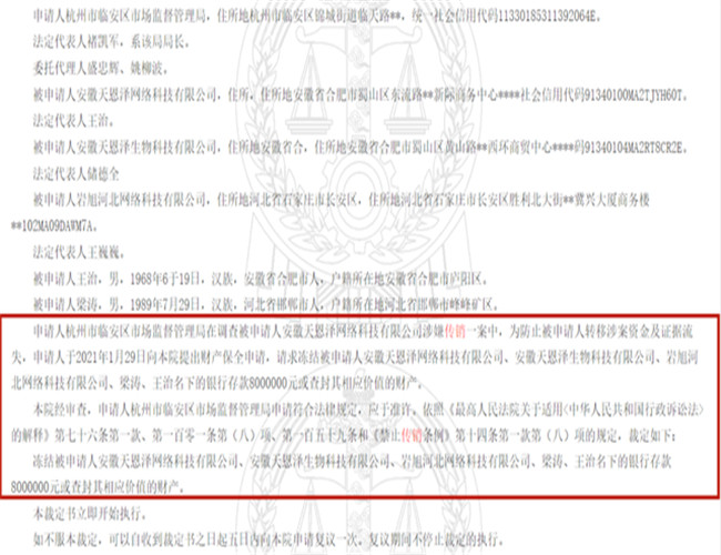 据该《行政裁定书》显示,申请人杭州市临安区市场监督管理局在调查被申请人安徽天恩泽网络科技有限公司涉嫌传销一案中,为防止被申请人转移涉案资金及证据流失,申请人于2021年1月29日向本院提出财产保全申请,请求冻结被申请人安徽天恩泽网络科技有限公司、安徽天恩泽生物科技有限公司、岩旭河北网络科技有限公司、梁涛、王治名下的银行存款8000000元或查封其相应价值的财产。